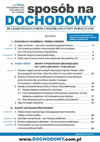 W październikowym wydaniu czasopisma Sposób na Dochodowy piszemy o klauzuli obejścia prawa podatkowego. Jednoosobowy przedsiębiorca wykupił z leasingu operacyjnego samochód osobowy. Obecne przepisy mówią, że nie można już po pół roku od daty wykupu sprzedać samochodu i zarobić na takiej transakcji nie płacąc w ogóle podatku dochodowego. Czy organy podatkowe mogą kwestionować następujący plan: przedsiębiorca (tata) daruje samochód córce, następnie córka odczeka pół roku i sprzeda auto bez podatku i dokona darowizny uzyskanej kwoty na rzecz taty? Czy to legalne? Poruszamy również temat ulgi na dziecko dla obywateli Ukrainy. Czy mogą z niej skorzystać? Zapraszamy do lektury!